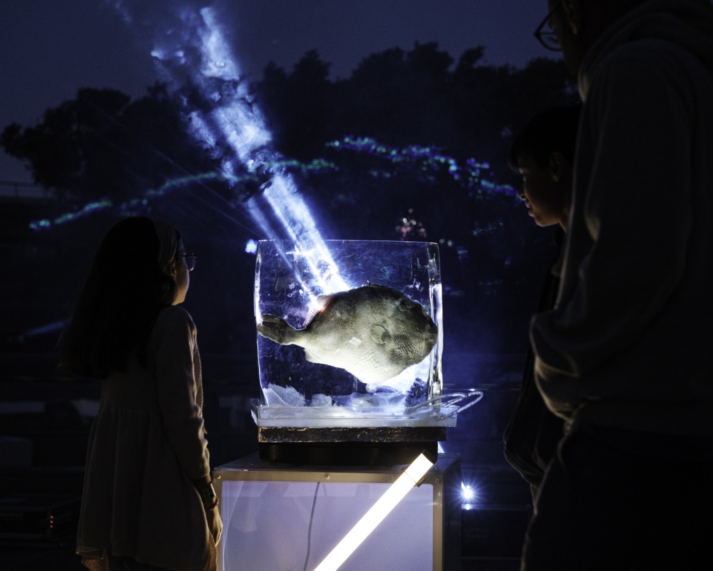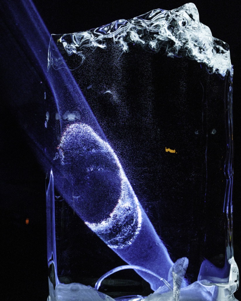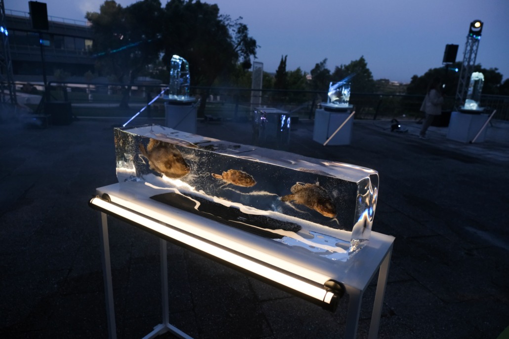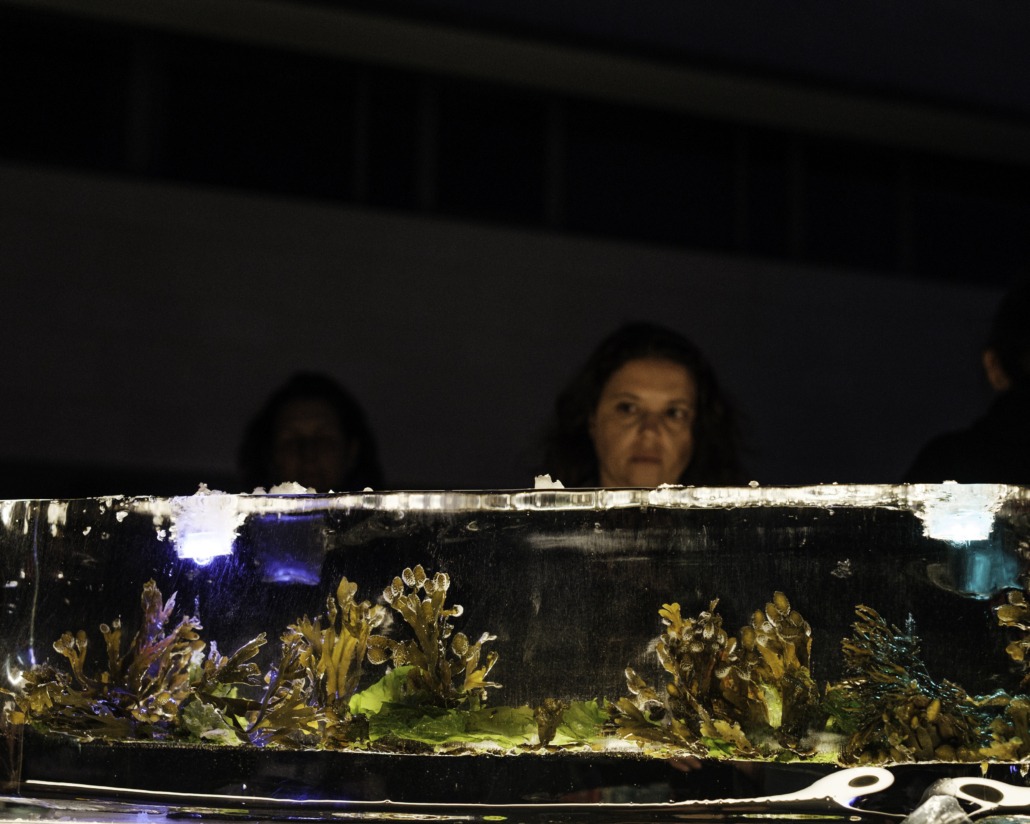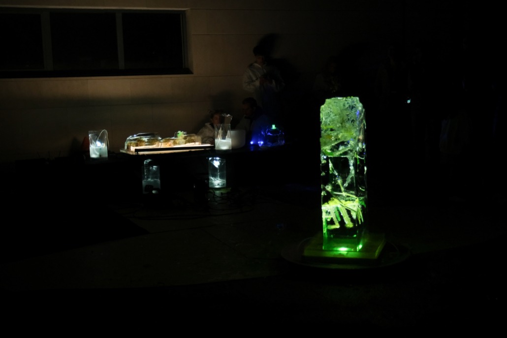 - Technique / Materials: AV installation / MacBook Pro, Avolites DMX interface, 4 laser projectors Laser World, 12 LED Lights, smoke machine, rotating plate, Acrilyc structures, fish, algae, aquatic plants, ice.